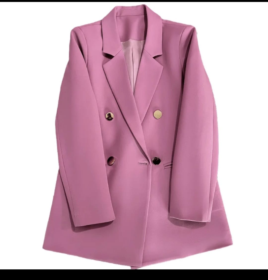 Bold Electric Royal Blue tailored jacket featuring signature gold heart-shaped buttons.